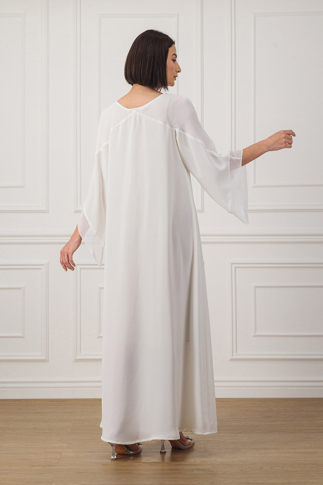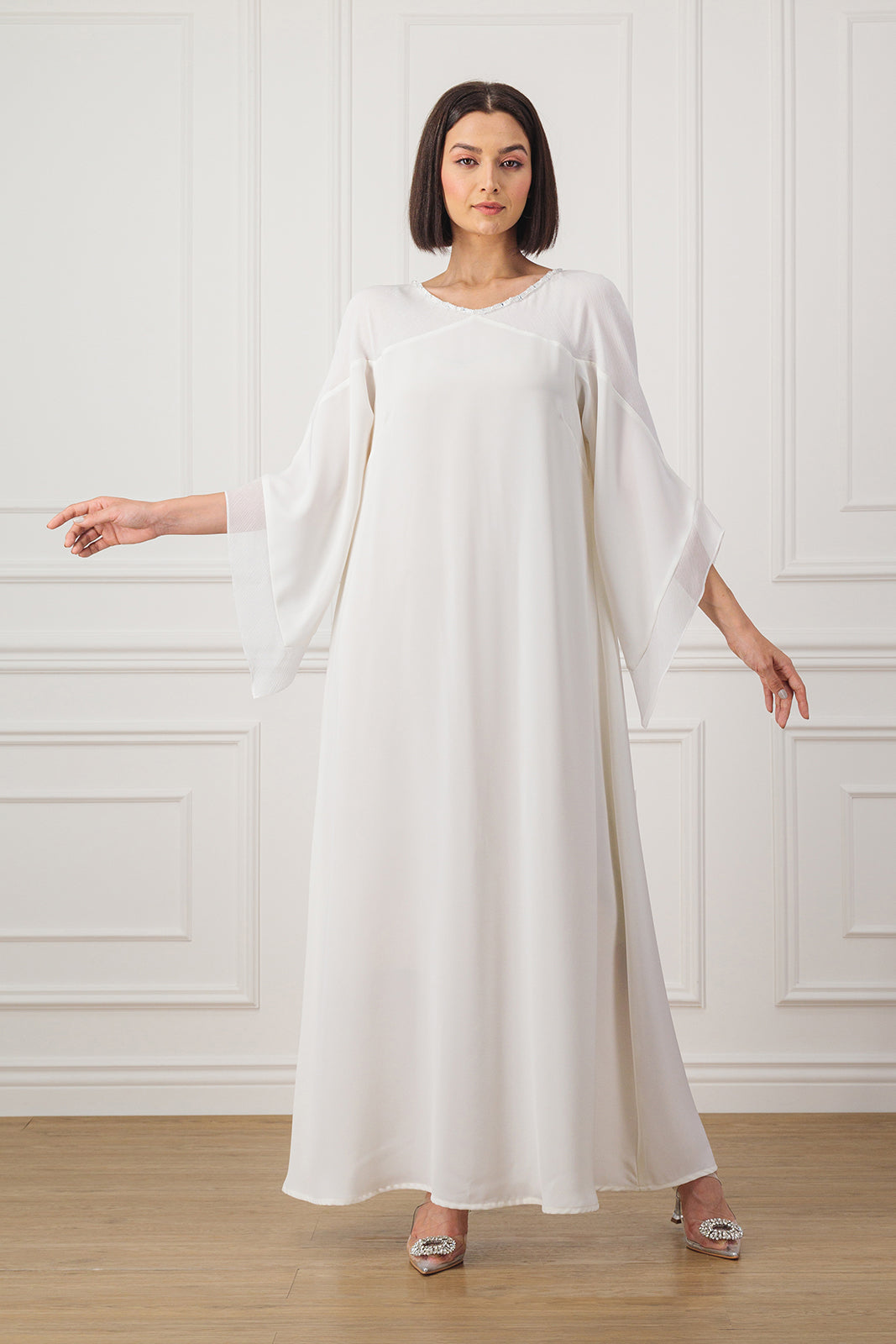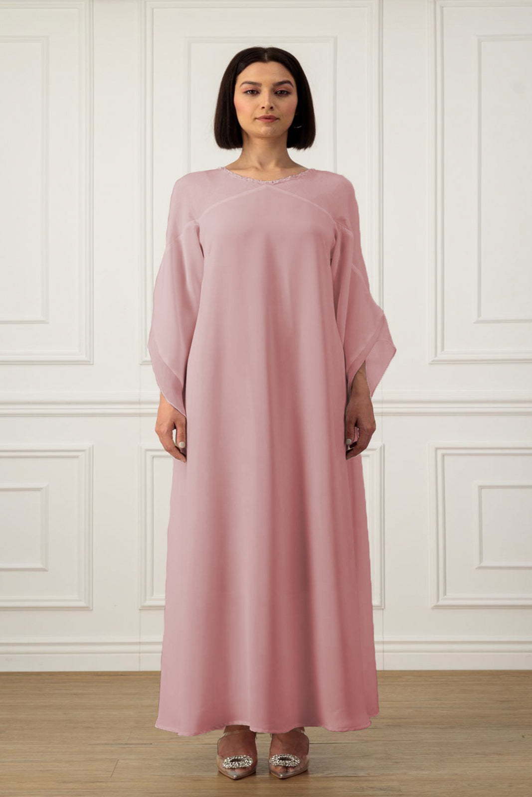 Bring a touch of sophistication to your wardrobe with this beautiful dress, made from premium fluid crepe with the addition of chiffon neckline & sleeves. The simple, yet elegant design is perfect for any occasion.