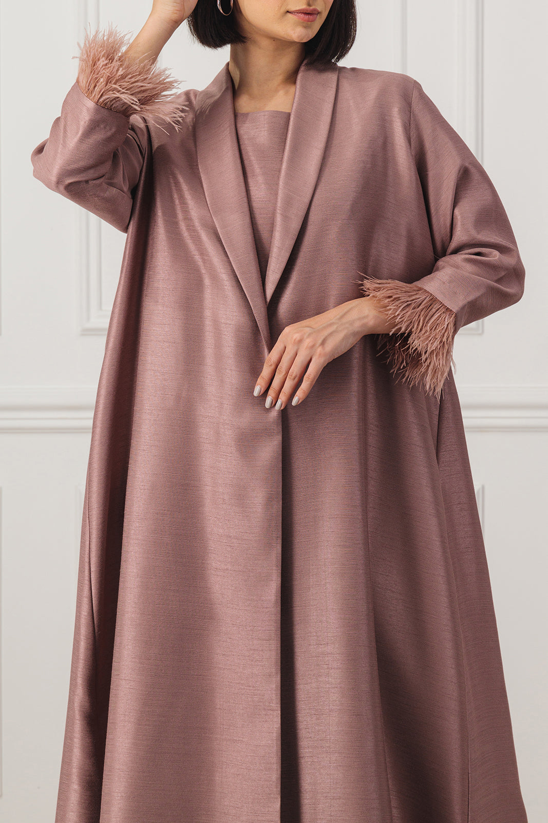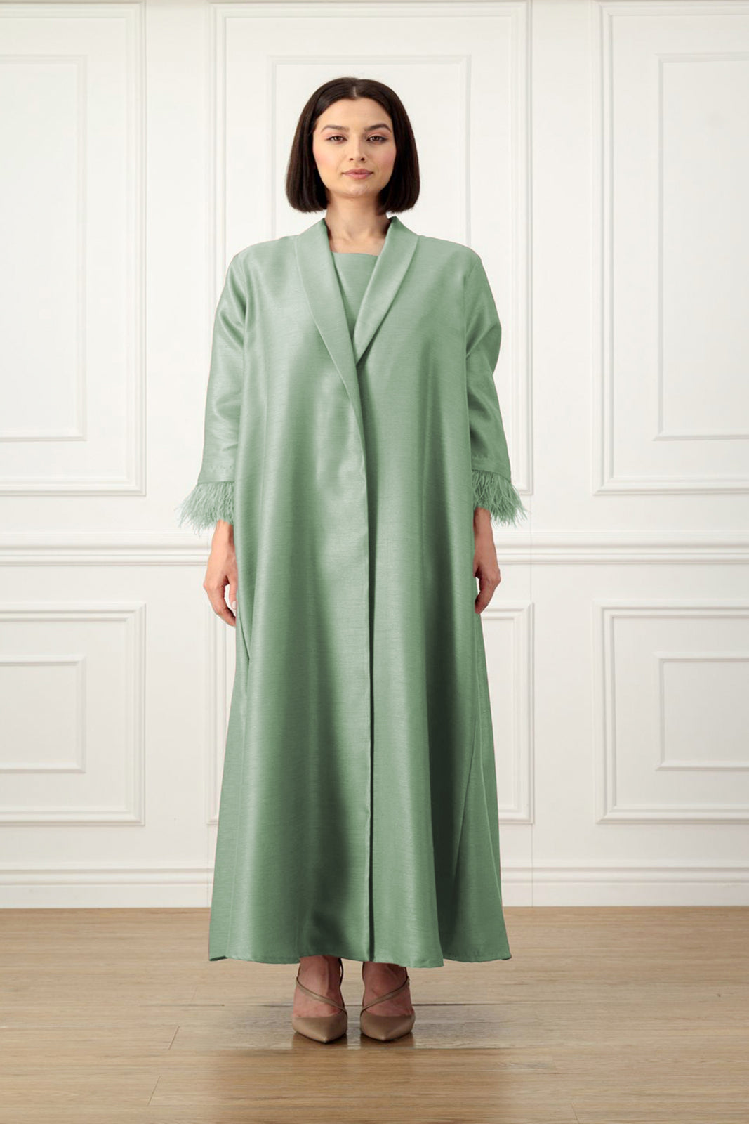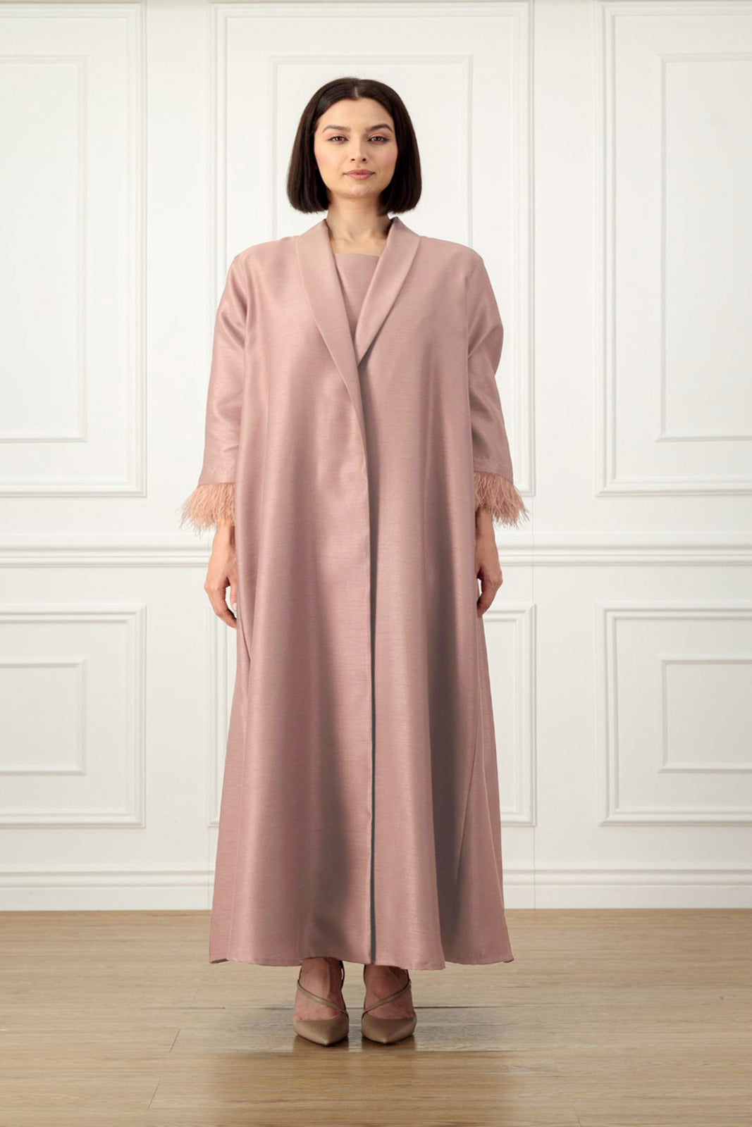 A classic A-line abaya with flared back crafted from premium Shantung with added feathers to the sleeves while the shimmering Shantung provides a touch of glamour is perfect for all occasions (Ramadan/Eid)
