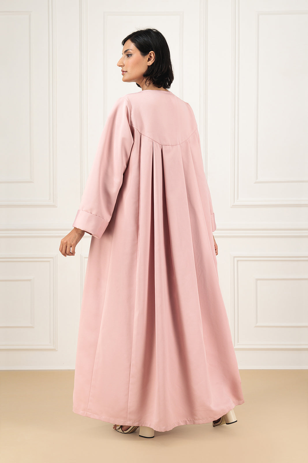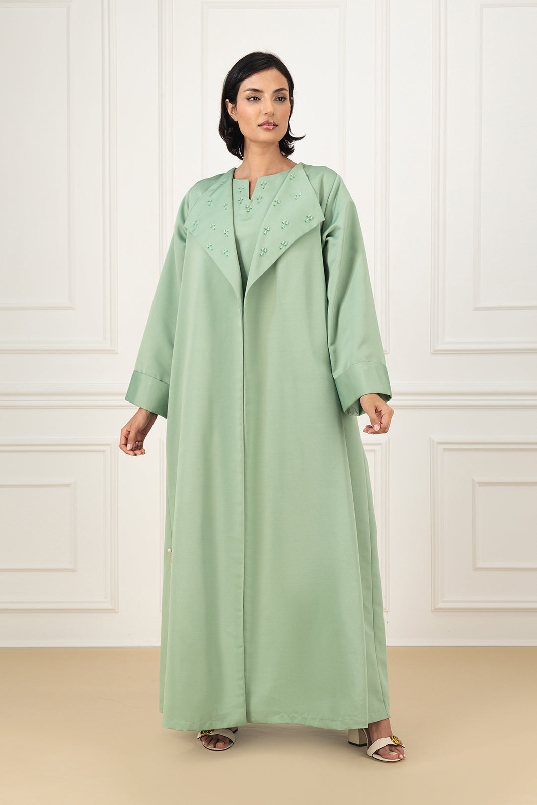 Top-tier stitching details with box pleats on the back and a classic textured abaya designed with lapels and touches of beads work a variety of mesmerizing palettes of colors.