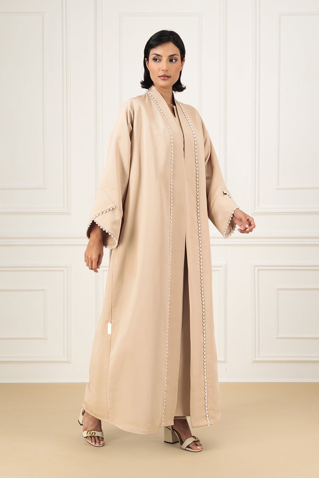 Elevate your wardrobe with this classic textured abaya adorned with mother-of-pearls trims on the sleeves, providing a unique and sophisticated look.