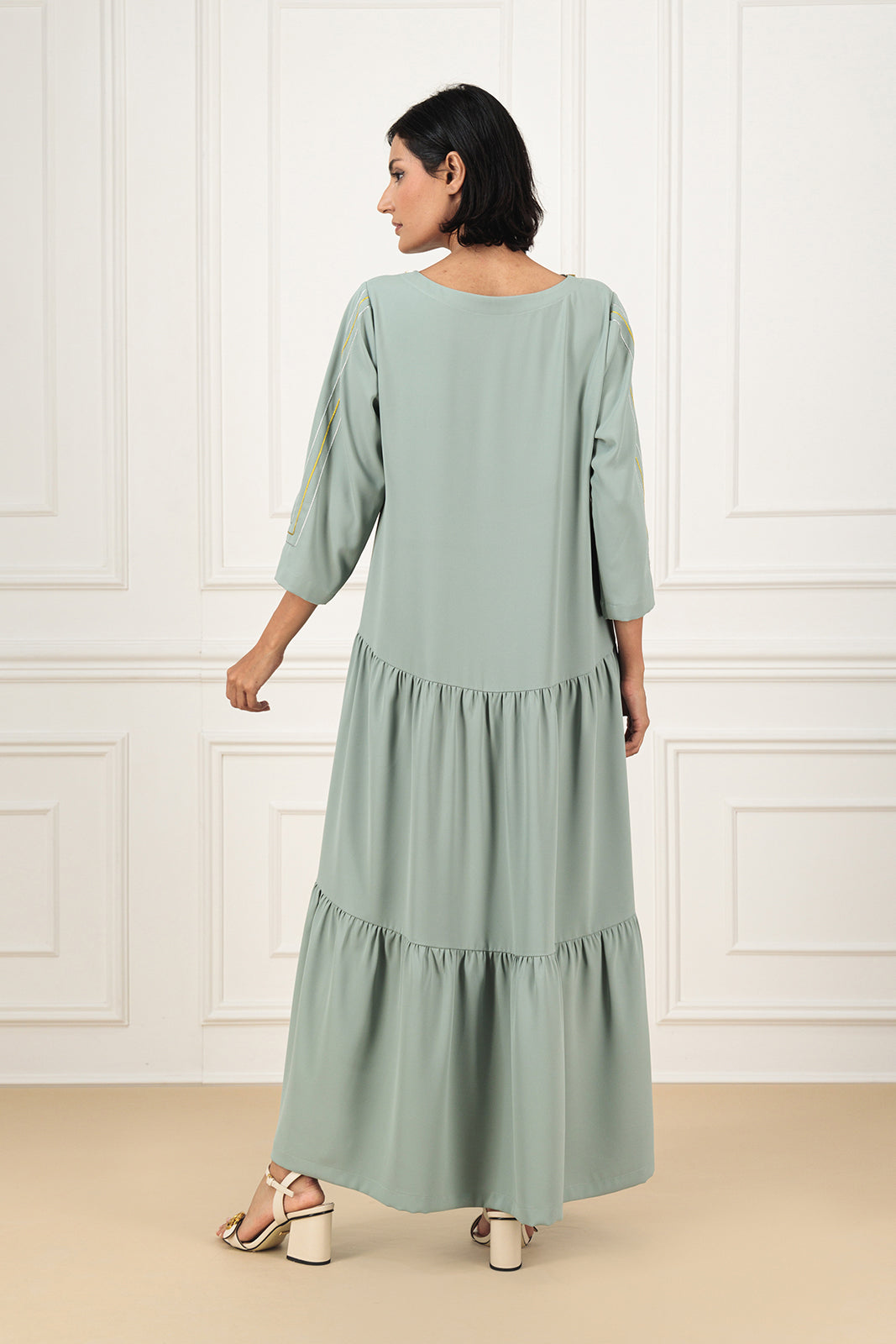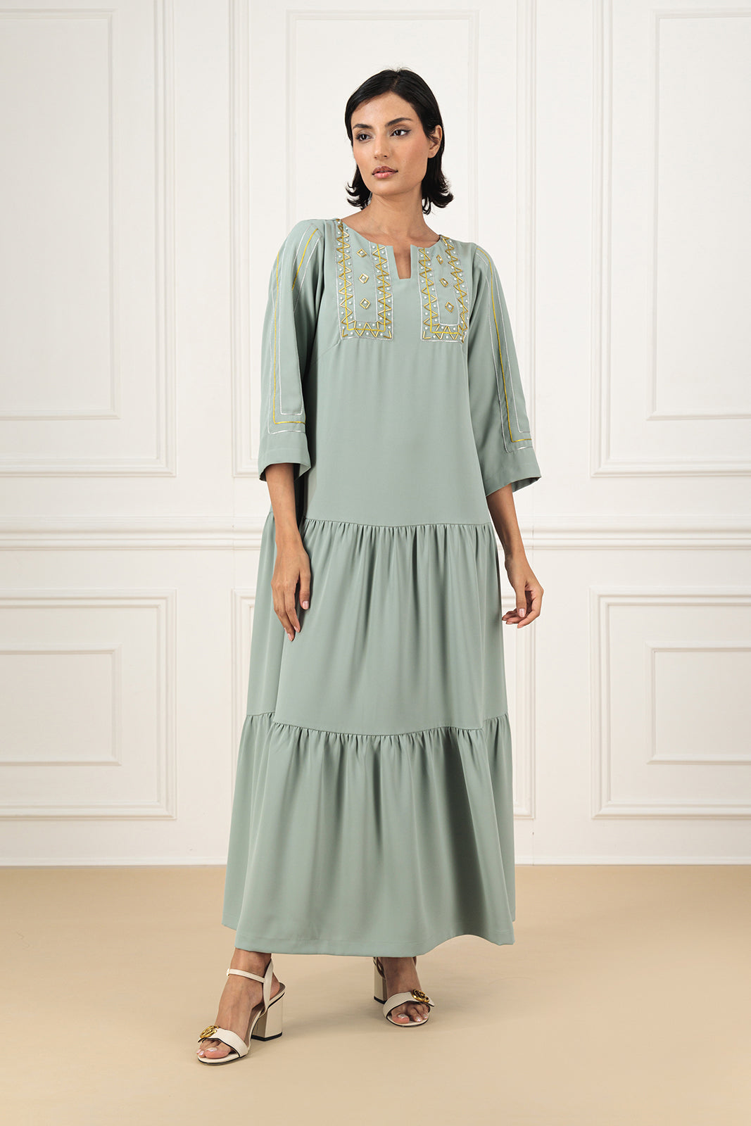 Infuse a touch of sparkle into your wardrobe with this modest crepe dress. Adorned with metallic thread work and bead detailing on the sleeves and neckline, its crafts a stunning and elegant look.