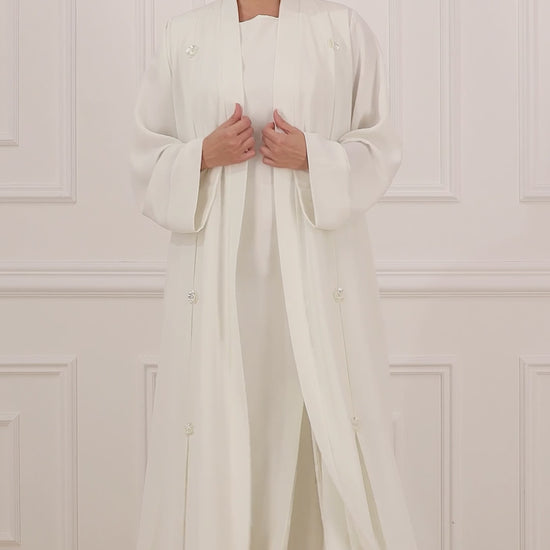 A timeless abaya set featuring intricate floral embossing, designed to exude elegance and sophistication. Complete with a matching inner dress, this set offers a graceful and refined look perfect for both everyday wear and special occasions.