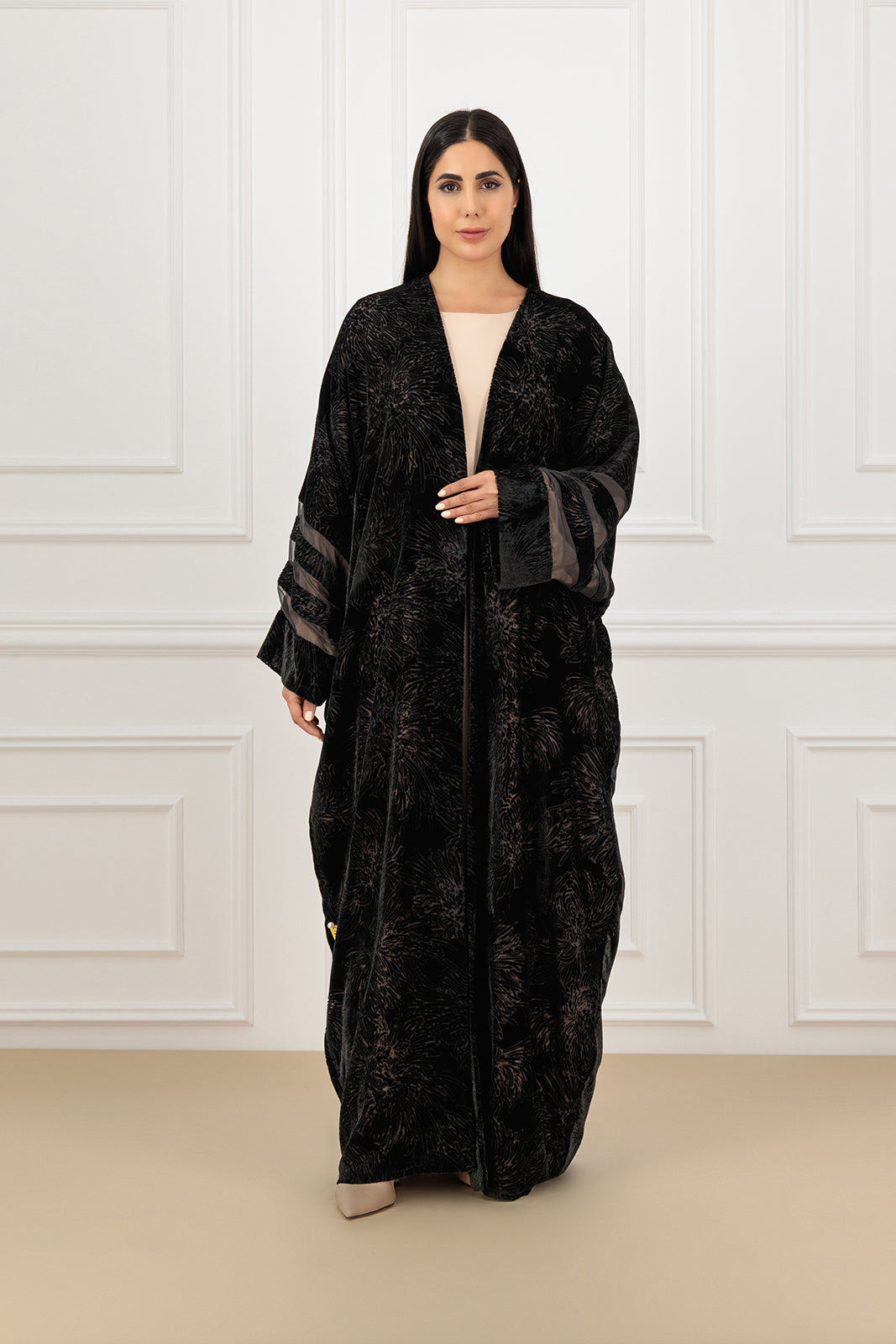 Luxurious farasha abaya crafted from soft textured velvet for an elegant drape and feel.